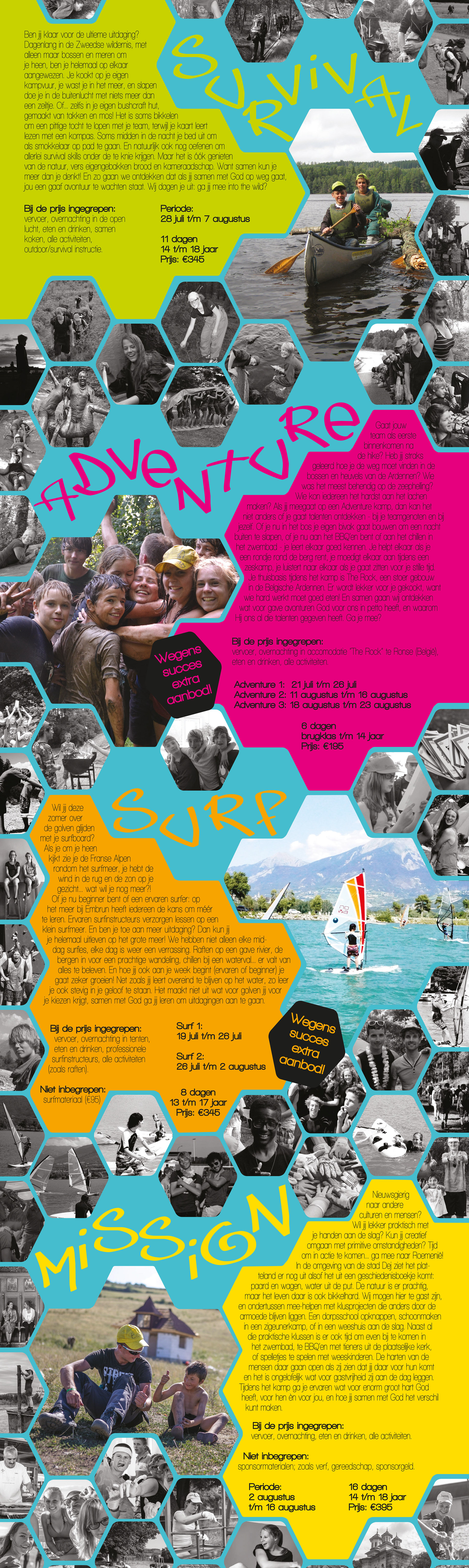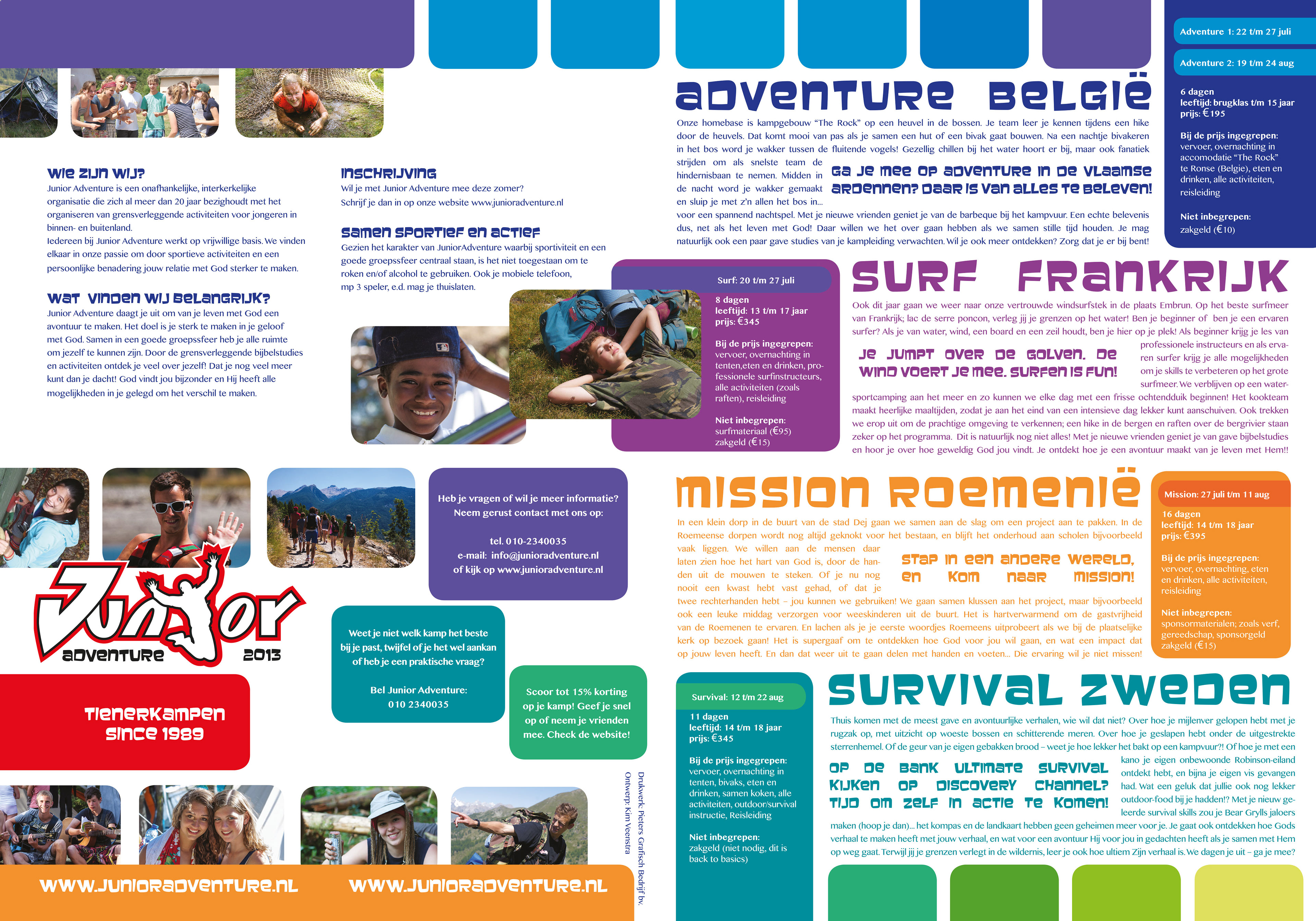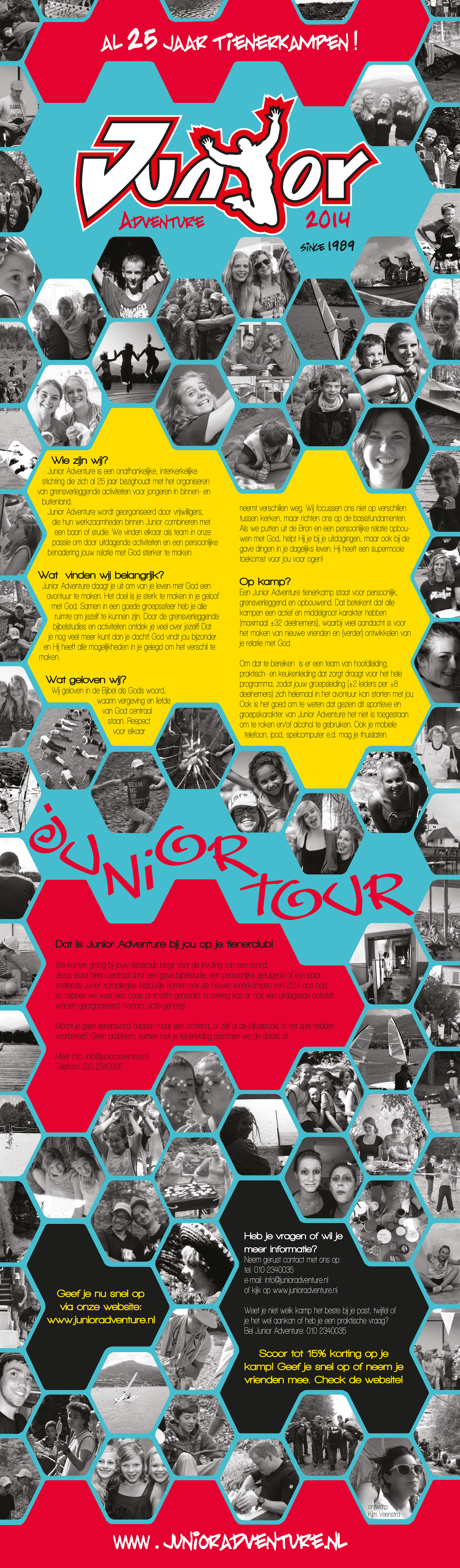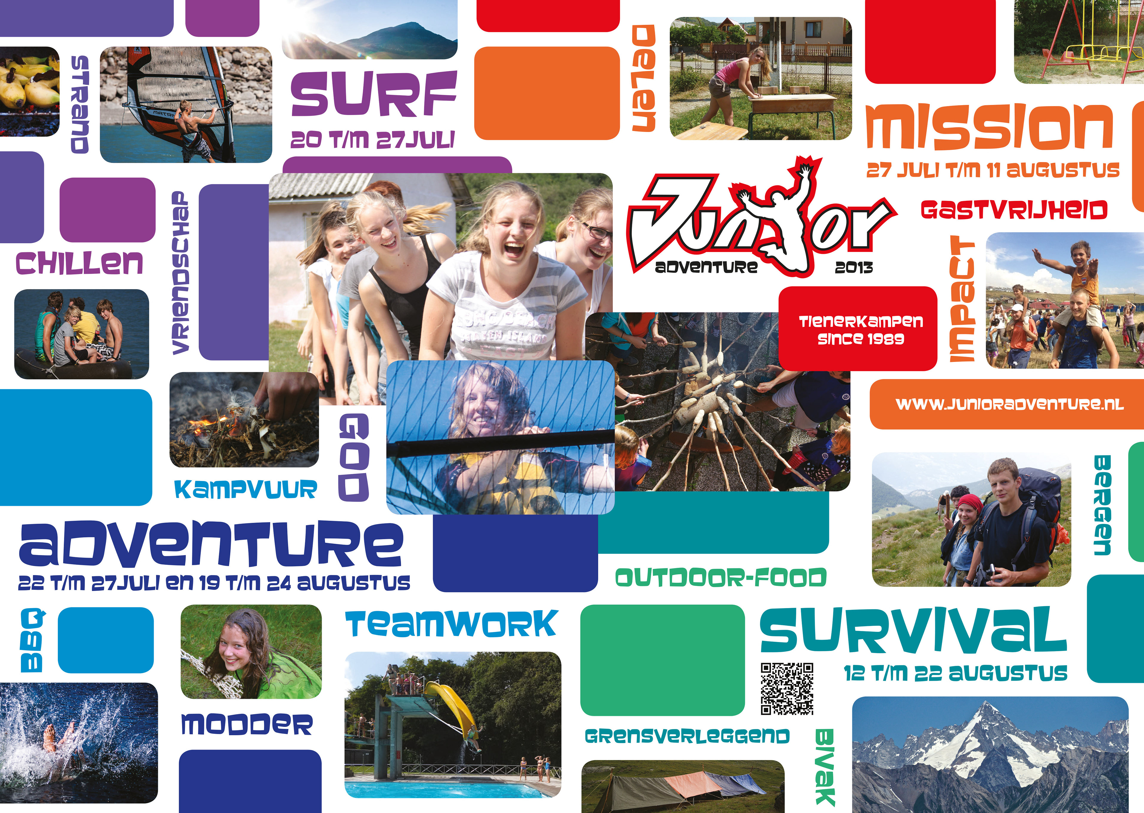 Junior Adventure is een organisatie die tienerkampen organiseert voor jongeren van 12-18 jaar. Verspreid over 10 jaar mocht ik verschillende ontwerpen maken zoals de jaarlijkse folder.